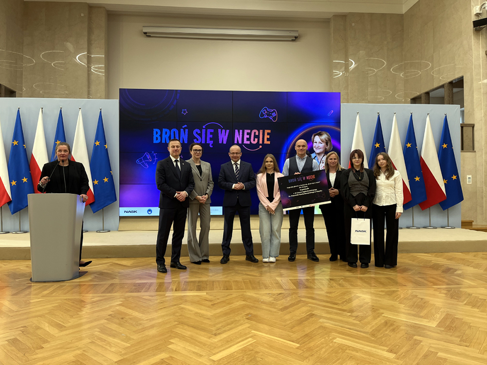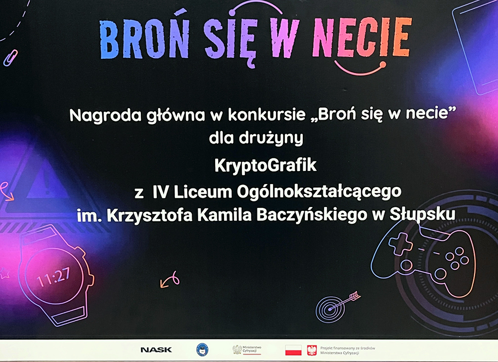 15 grudnia br. w Kancelarii Prezesa Rady Ministrów w Warszawie, odbyła się gala finałowa konkursu edukacyjnego „Broń się w necie!" organizowanego przez Państwowy Instytut Badawczy NASK oraz Ministerstwo Cyfryzacji we współpracy z Agencją Bezpieczeństwa Wewnętrznego. Ze względu wymogów bezpieczeństwa zaproszono 3 przedstawicielki zwycięskiej 10-cio osobowej drużyny klasy graficznej IV LO w Słupsku, które odebrały nagrody rzeczowe przyznane laureatom — smartwatch’e dla uczniów, konsolę PS5 z czterema padami, ekranem i akcesoriami dla szkoły. Podziękowania i gratulacje uczennice otrzymały od Ministra Cyfryzacji oraz Ministra Obrony Narodowej - za wkład w promowanie bezpiecznego i świadomego korzystania z internetu :-) Ogromne gratulacje dla całej drużyny!